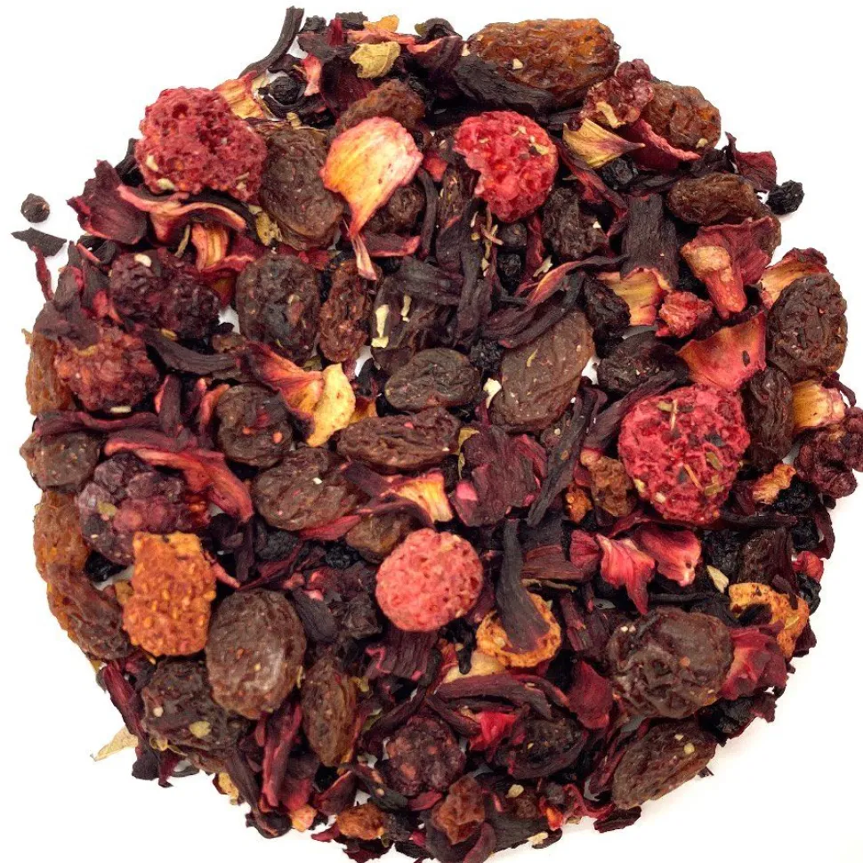 Ingrediënten: hibiscus kelken, rozijnen, vlierbessen, aroma’s, (gevriesdroogde) bramen-frambozen en aardbeien, braamblad, blauwe bessen en zwarte bessen