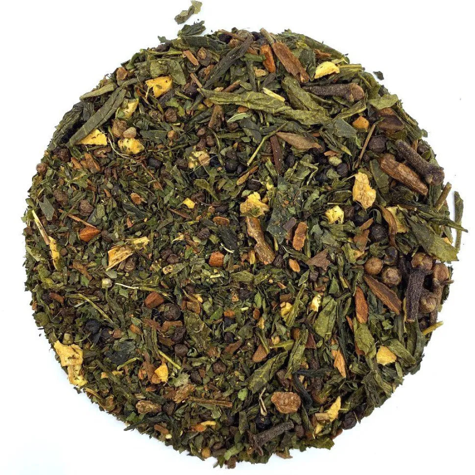 groene thee (32%) kardemom, gember, kruidnagel, zwarte peper, kaneel, munt, aroma’s