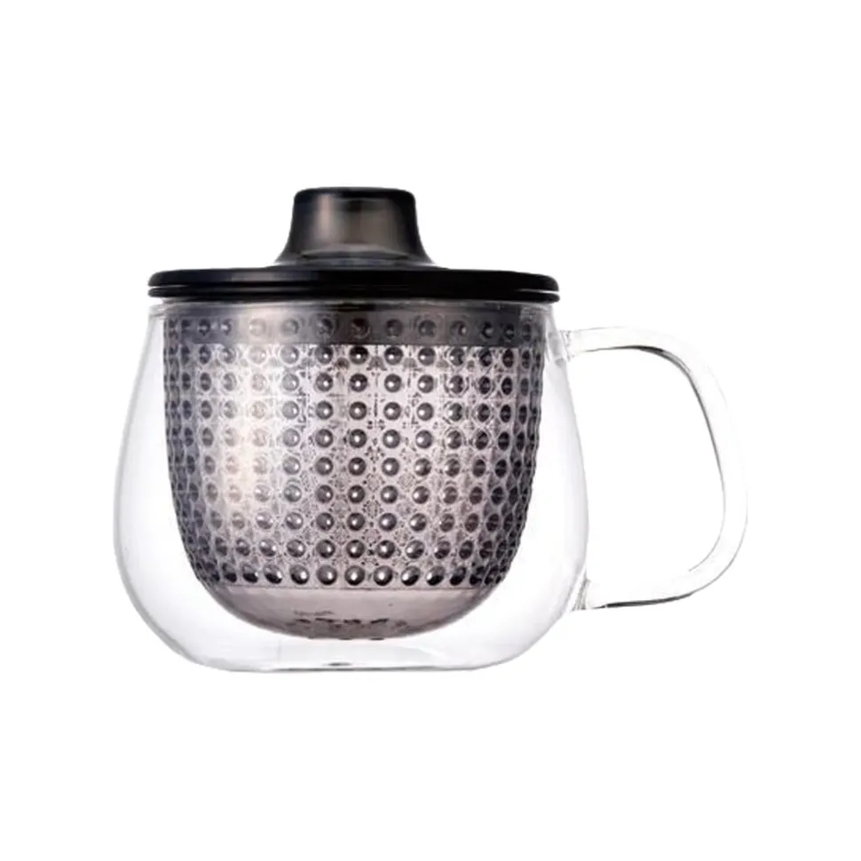 Unimug Navy transparante glazen theetas met filter van het merk Kinto.